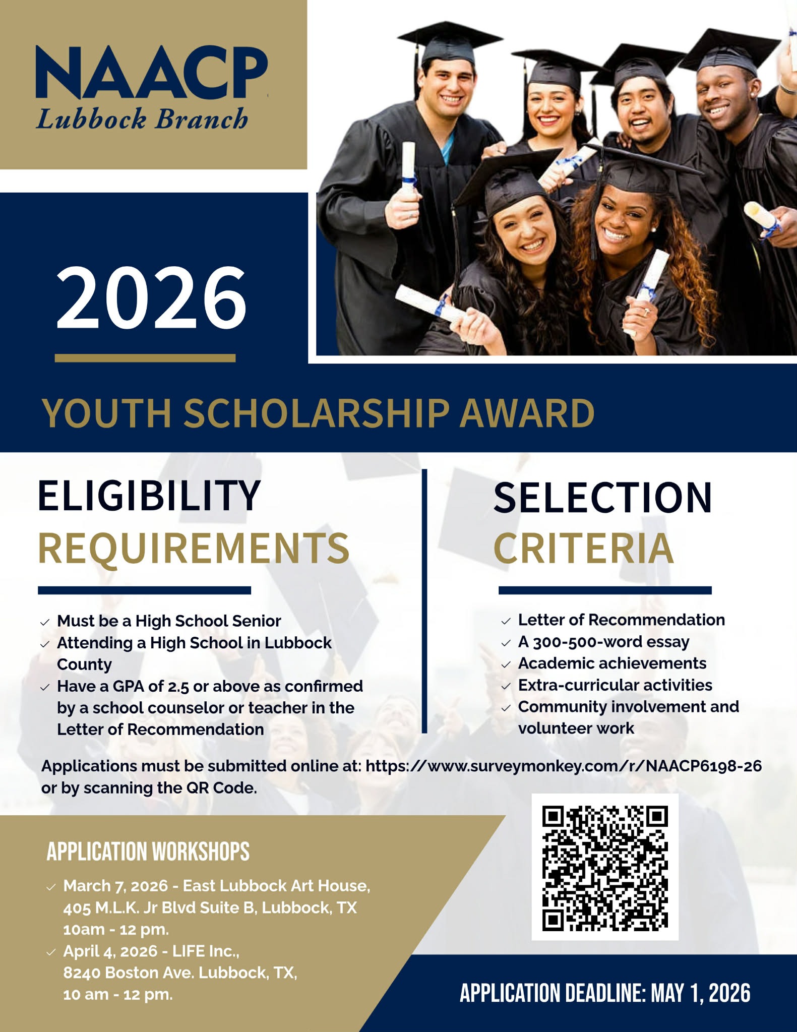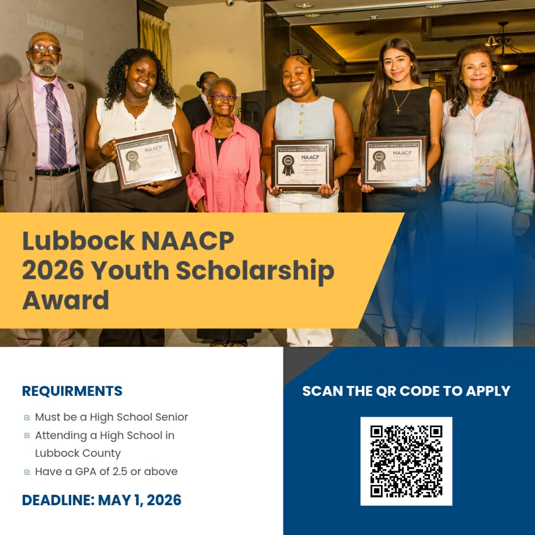 Lubbock NAACP holds an annual fundraiser to fund our scholarship program. In the spring, applications are received, and scholarships are awarded to high school seniors in the fall.